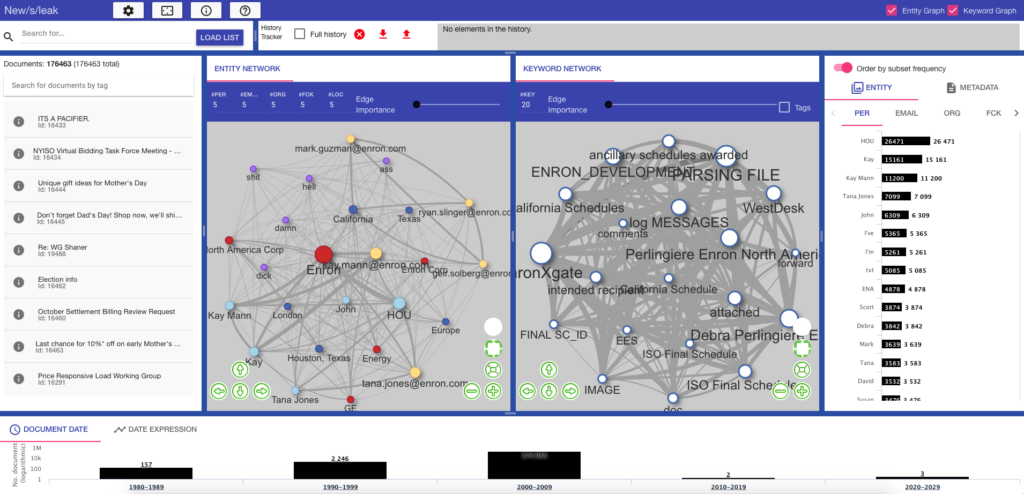 Professor Chris Biemann der Universität Hamburg entwickelte mit seinem Team der Abteilung Language Technology in Kooperation mit dem Hamburger Verlagshaus „Der Spiegel“ einen Softwareprototypen, der die Recherchearbeit von Datenjournalistinnen und -journalisten unterstützt: Im Rahmen des von der Volkswagenstiftung finanzierten Projekts „new/s/leak – network of serchable leaks“ entwickelte das Forschungsteam einen Prototypen, der übereinstimmende Namen, Organisationen und Orte innerhalb riesiger Datenmengen automatisch identifiziert, um sie im Anschluss innerhalb eines Netzwerk-Diagramms zu visualisieren. Auf diese Weise lassen sich Strukturen in unstrukturierten Daten sichtbar machen und Zusammenhänge schneller erkennen, wodurch beispielsweise wichtige Akteure einer Geschichte im Rahmen digitaler Dokumentkollektionen herausgefiltert werden können. Mithilfe der Software lassen sich also unbekannte Dokumentbestände schneller erschließen und analysieren, was insbesondere angesichts des journalistischen Zeitdrucks überaus hilfreich ist.