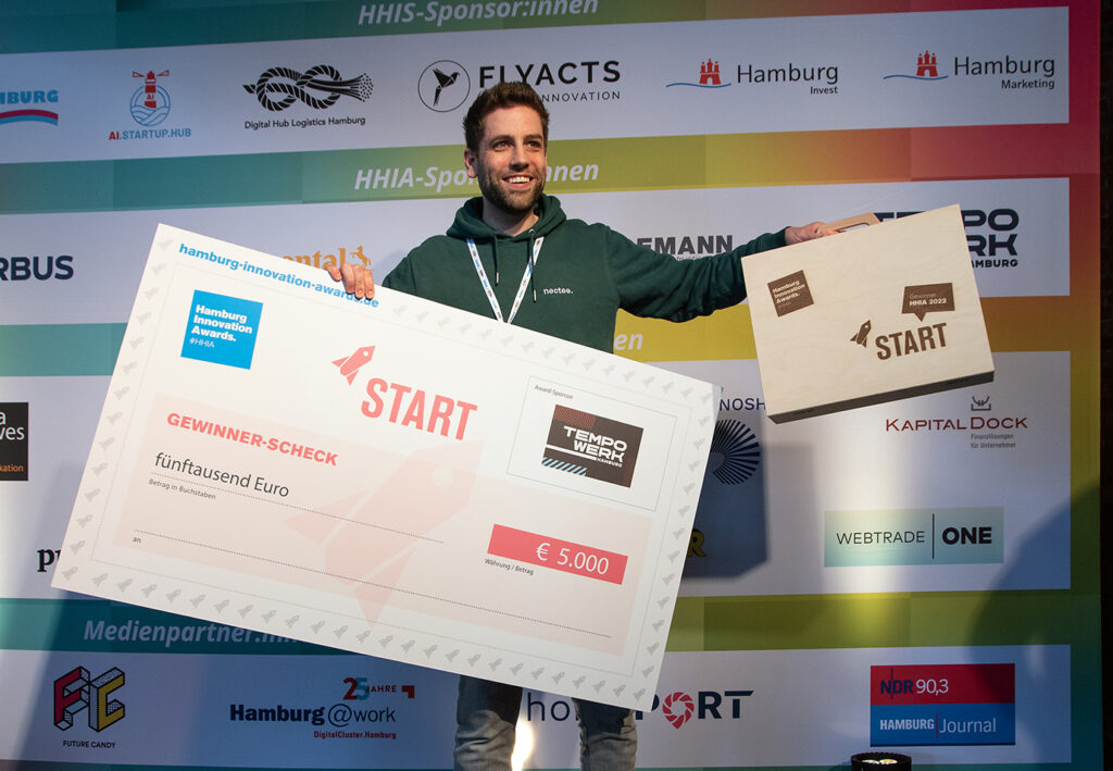 Im Rahmen des Hamburg Innovation Summits (HHIS) vom 2.6.-3.6.22 wurden am ersten Veranstaltungstag in der Fischauktionshalle die Hamburg Innovation Awards an drei Startups in den Kategorien Idee (DePla Regeneration), Start (Nect) und Wachstum (Luis Technology) verliehen. Die über 1.000 Teilnhehmer:innen des HHIS konnten zudem per Liveabstimmung über die Vergabe des Publikumspreises abstimmen: das Hamburger Startup Nect wurde auf diesem Wege doppelt ausgezeichnet.