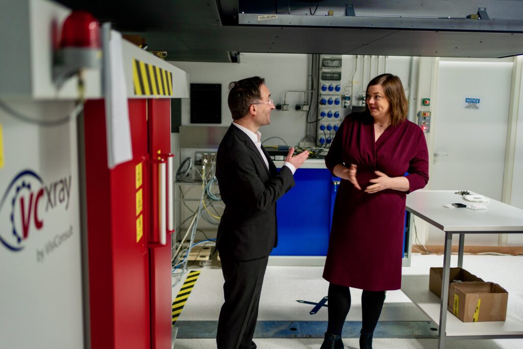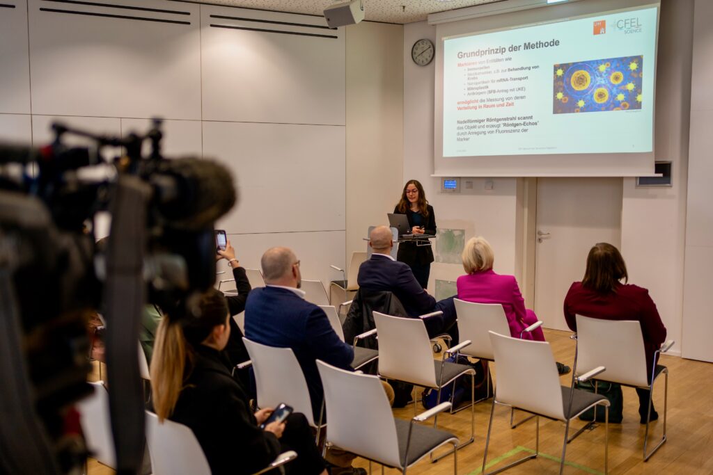 Im Rahmen des Besuchs von Wissenschaftssenatorin Katharina Fegebank am Center for Free-Electron Laser Science (CFEL) präsentierte das Team um Professor Florian Grüner (Institut für Experimentalphysik, Universität Hamburg) die vielversprechenden Ergebnisse des interdisziplinären Forschungsprojekts „Neuartige Labor-Röntgenquelle für deutlich leichteren Zugang und schnellere Weiterentwicklung von Röntgenstrahl-basierter Forschung“. In Zusammenarbeit mit dem Universitätsklinikum Hamburg-Eppendorf (UKE) hat die Forscher:innengruppe eine röntgenbasierte Bildgebungsmethode weiterentwickelt, die Einblicke und Daten für die Bekämpfung chronischer Krankheiten liefern kann. Das Forschungsprojekt, an dem Wissenschaftler:innen aus den Fachbereichen Physik und Medizin gemeinsam arbeiten, wurde durch das Förderprogramm „Calls for Transfer“ (C4T) finanziert.